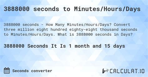 = 3888000 seconds. There are some references to = 3888000 seconds in this article. If you are looking for = 3888000 seconds you've came to the right place. We have posts about = 3888000 seconds. You can check it out below.