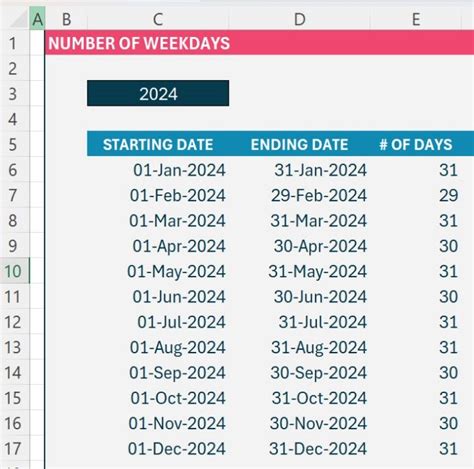 excel count number of weekdays in a month